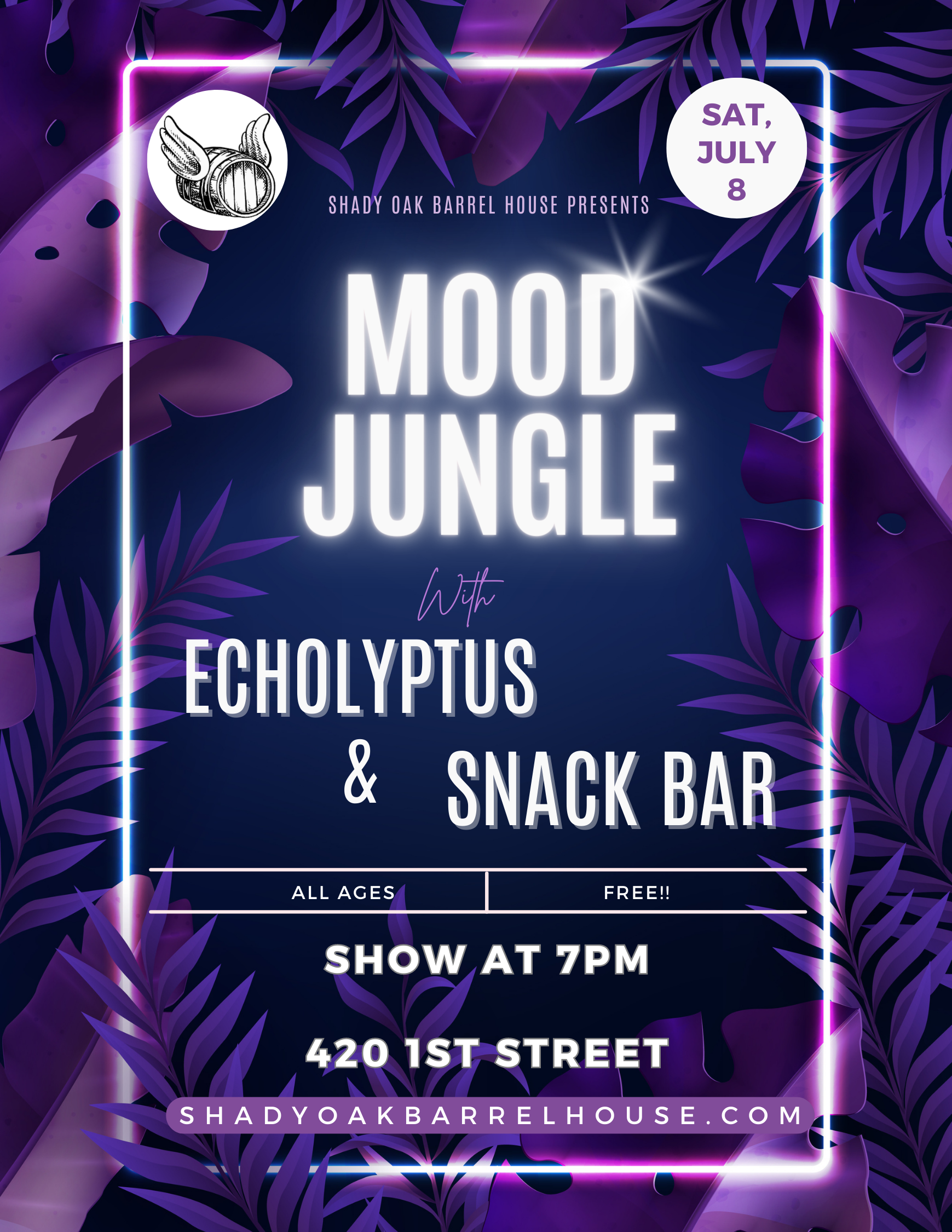 LIVE MUSIC: MOOD JUNGLE/ ECHOLYPTUS/ SNACK BAR Saturday, July 8, 2023 7:00 PM 10:00 PM 19:00 22:00 Shady Oak Barrel House Sonoma County, California (map) Google Calendar ICS Join us for some awesome Indie tunes from Mood Jungle, Echolyptus, Snack Bar!FREE, ALL AGES.