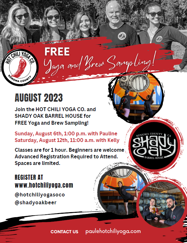 Join the HOT CHILI YOGA CO. at SHADY OAK BARREL HOUSE for FREE Yoga and Brew Sampling this August!