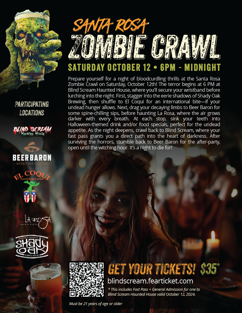 Stumble around downtown with fellow zombies on a Zombie (bar) Crawl organized by our neighbors with Blind Scream! Get your spooky stumble on and enjoy tricks and treats with our neighbors! All participating zombies will get happy hour pricing! Be sure to try out Shady Oak’s bloody raspberry seltzer!