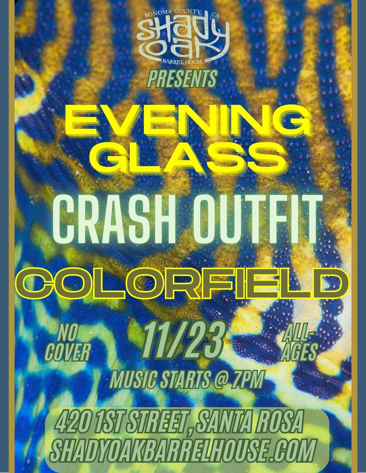 Shady Oak presents an evening of rocking music with @evening_glass , Crash Outfit (https://crashoutfit.bandcamp.com/album/demo), and Colorfield (https://soundcloud.com/jack-wirth-643764898/full-set-for-band )