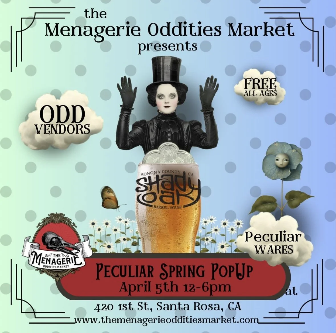 The Menagerie Spring Peculiar Popup is BACK at Shady Oak! 🌿🦴✨ Step into a world of oddities, curiosities, and strange delights on Saturday, 12–6 PM at Shady Oak Barrel House in Santa Rosa. This is not your average market—we’re talking bones, bugs, taxidermy, dark art, strange home decor, fine jewelry, antiques, medical specimens, and more. 🎭 Join our curious cast of misfits and collectors for a wild showcase you won’t find anywhere else! 🔥