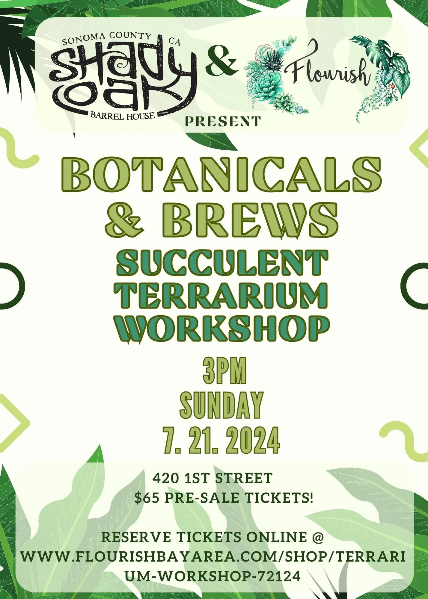 Join us for a Terrarium Workshop hosted by Flourish. Learn all about how to care for succulents as you create a beautiful glass terrarium filled with succulents, pebbles, and vibrant mosses! Your ticket includes all of the supplies for one terrarium PLUS a beverage of your choice (alcoholic or non-alcoholic) from the bar at Shady Oak Barrel House!