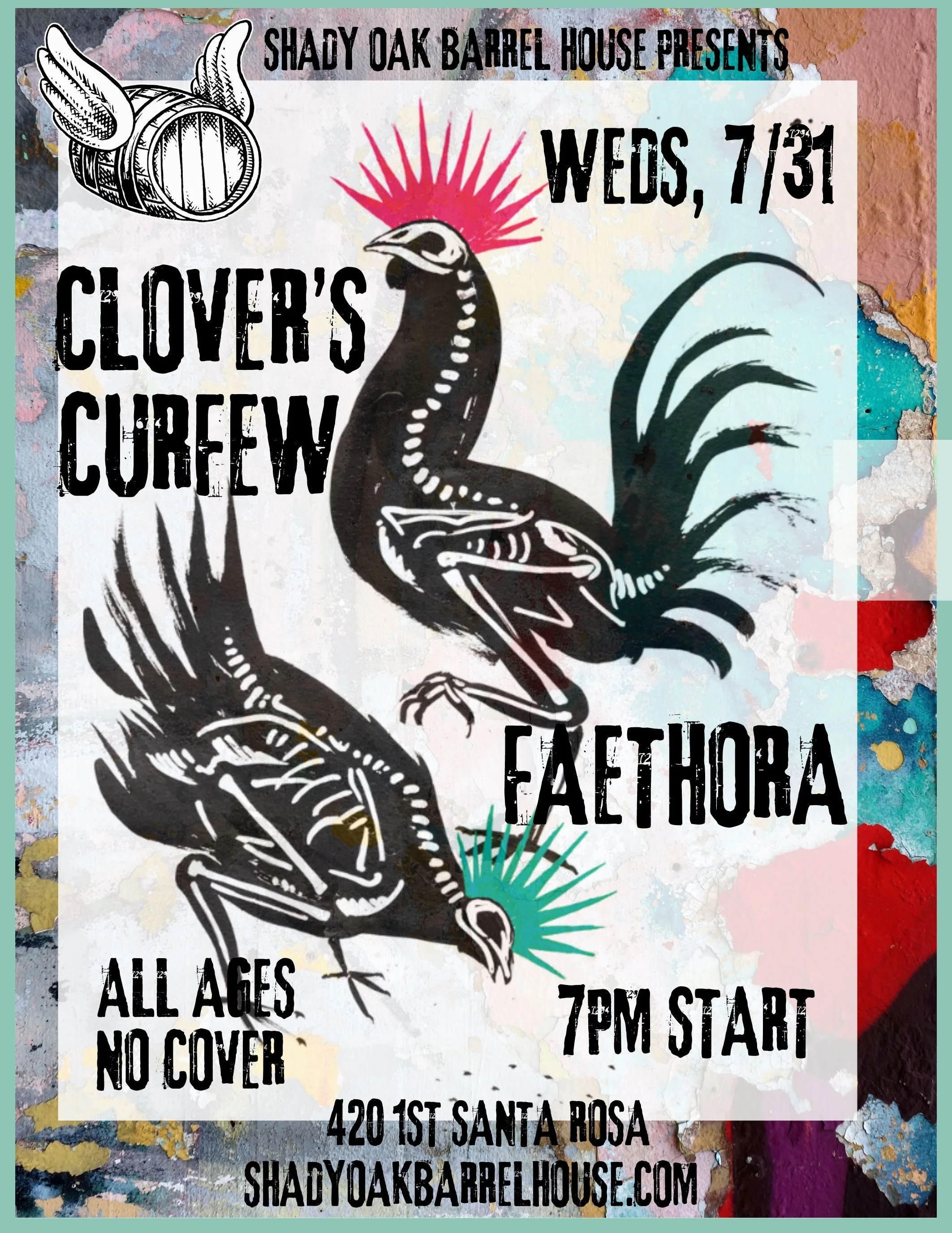 Special Wednesday night show with our friends Clover’s Curfew on tour from Long Island, NY!! These incredible folk punks just got married!! We are stoked to have them play a show with the talented Faethora at Shady Oak. Come out for a folkin’ good time!!