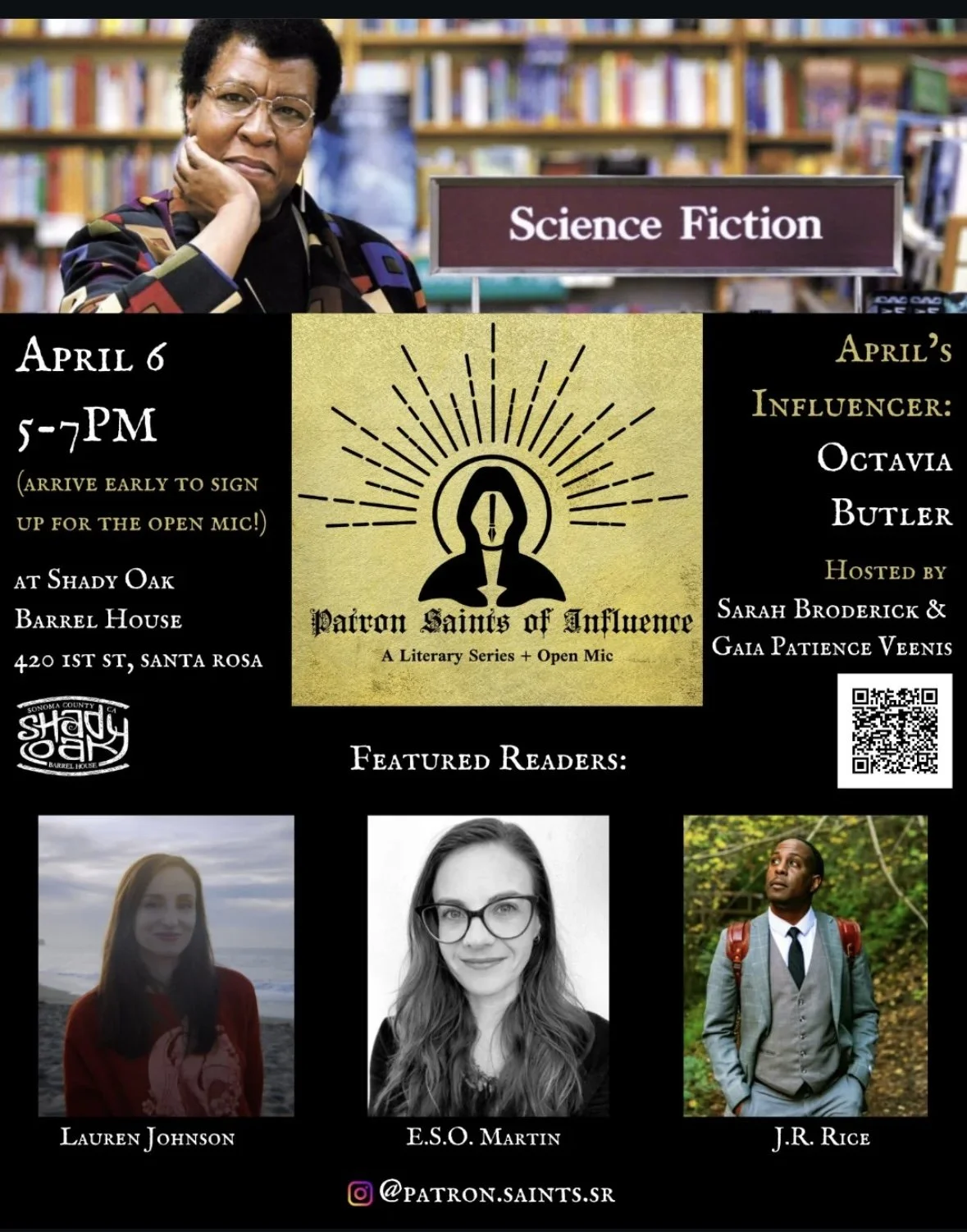 We’re welcoming back the Patron Saints to Shady Oak Barrel House in Santa Rosa! They’ll pay tribute to the legendary speculative fiction writer Octavia Butler with featured readings by Lauren Johnson, E.S.O. Martin, and J.R. Rice 🙌 And as always, we’re inviting YOU to take the stage during the open mic, where you can share your written work poetry, stories, or anything creative in 5 minutes or less. ✨ Stay tuned for more info about the featured readers on Instagram @patron.saints.sr