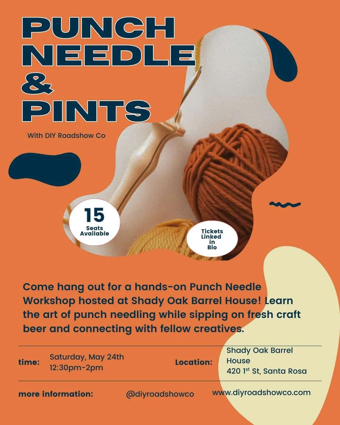 Come hang out for a hands-on Punch Needle Workshop hosted at Shady Oak Barrel House! Learn the art of punch needling while sipping on fresh craft beer and connecting with fellow creatives. You'll create your own textured design — no experience needed. They'll guide you step-by-step, so you can relax, get crafty, and leave with a finished piece that's totally your style.