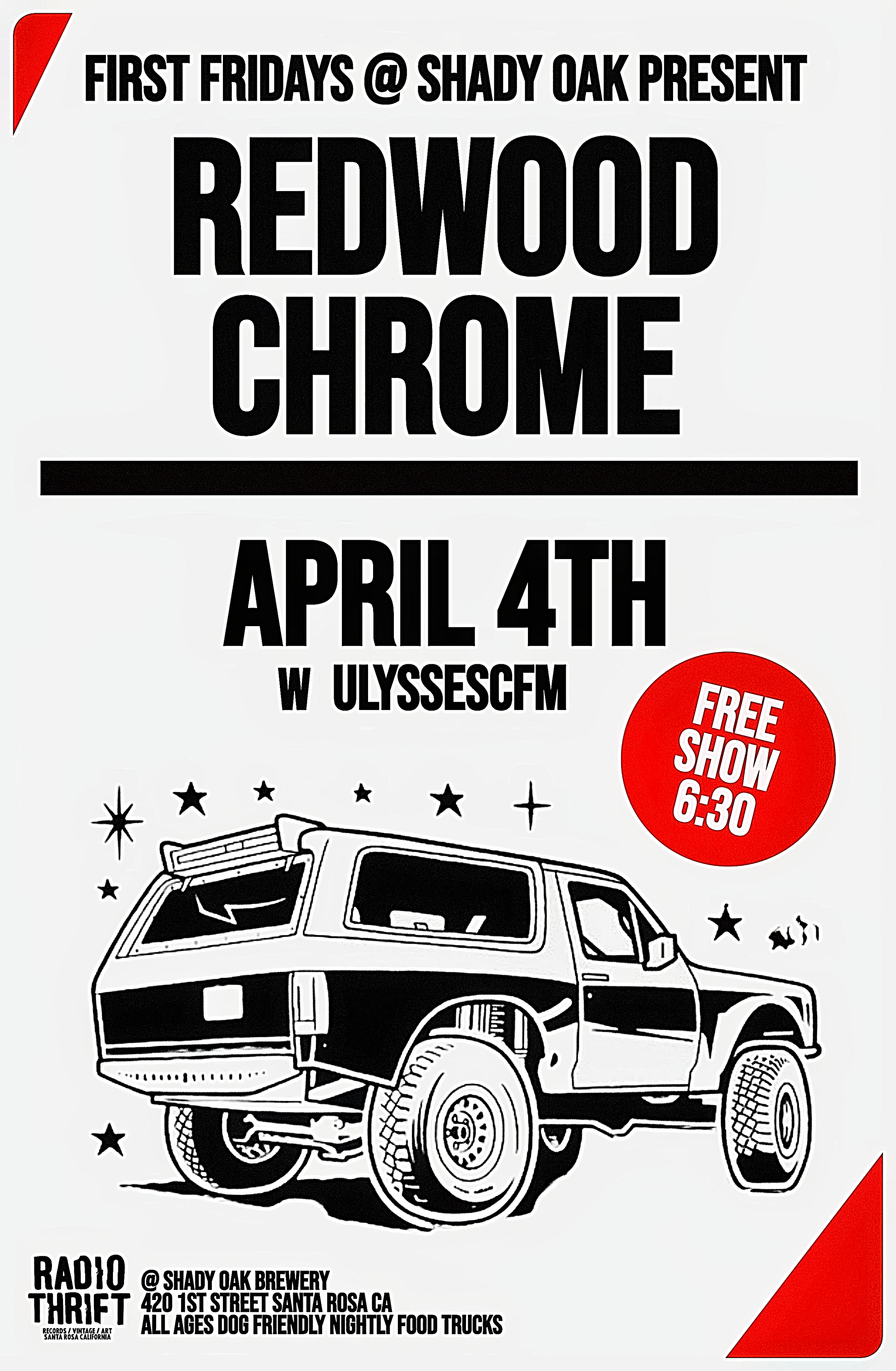 Shady Oak Barrel House is proud to host Redwood Chrome for their First Friday residency, bringing high-energy live music to our stage every month. Each show features a rotating lineup of special guest performers, making every First Friday a unique experience. This month, Redwood Chrome is joined by ULY, delivering an electrifying night of sound and energy. Presented by Radio Thrift, this ongoing series is all about great music, craft beer, and good vibes. Join us every First Friday at Shady Oak for a night of killer tunes and community spirit because Santa Rosa deserves to rock.